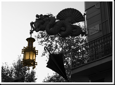 "At the end of the La Rambla de les Flors, on the left side, we come to one of the promenade's most unique buildings: the Casa Bruno Quadros. It is also known as the House of Umbrellas, since the owner became a millionaire selling this accessory and several umbrellas decorate the facade. This is a rather eccentric but original building, whose other outstanding feature is the figure of a Chinese dragon mounted on the corner that keeps menacing watch over the Rambla."